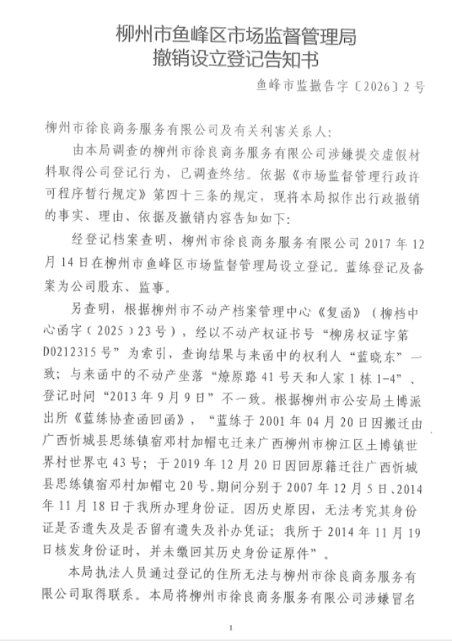 本局于2026年2月3日作出《撤销设立登记告知书》(鱼峰市监撤告字〔2026〕2号),因无法通过直接或邮寄等方式送达上述告知书,本局现依法公告送达。