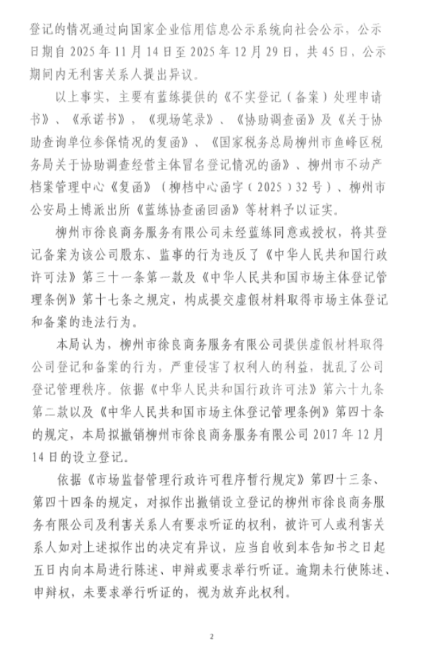 柳州市徐良商务服务有限公司及有关利害关系人: