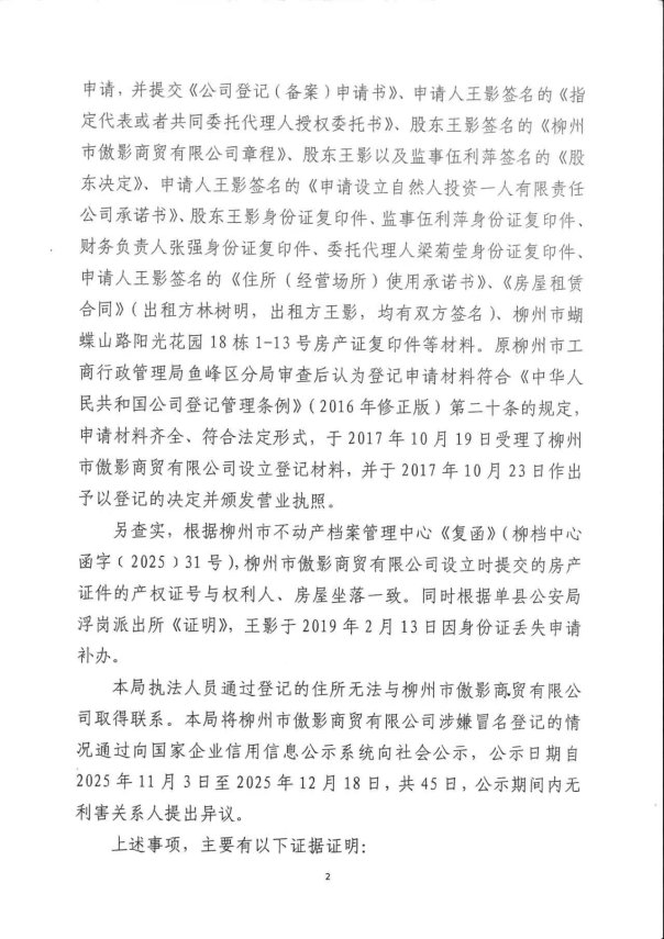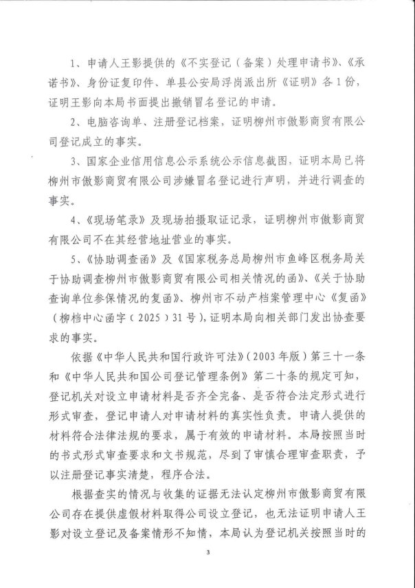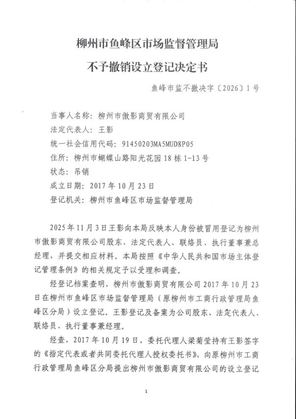 附:《柳州市鱼峰区市场监督管理局不予撤销设立登记决定书》(鱼峰市监不撤决字〔2026〕1号)