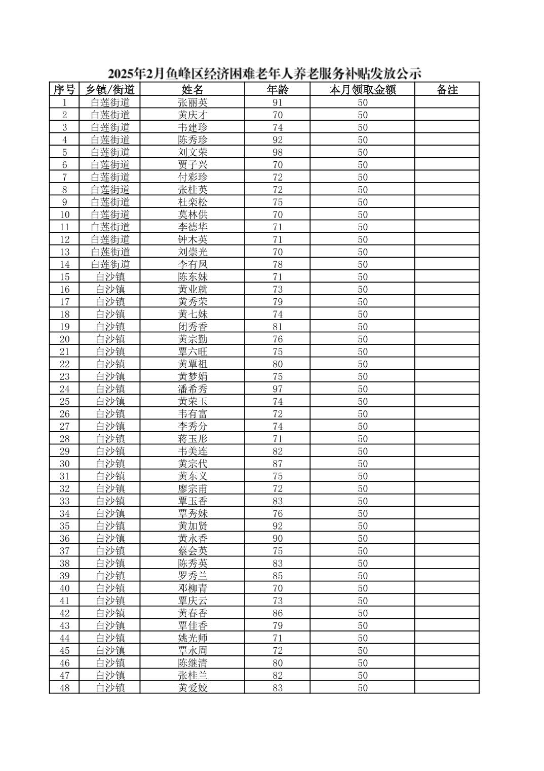 2025年2月鱼峰区经济困难老年人养老服务补贴发放公示
