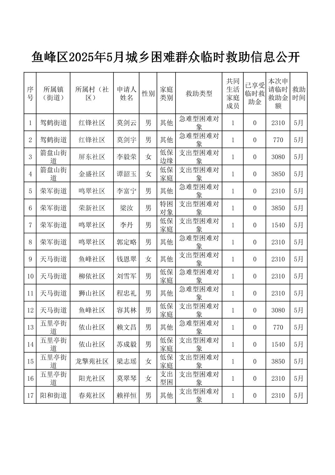 鱼峰区2025年5月城乡困难群众临时救助信息公开