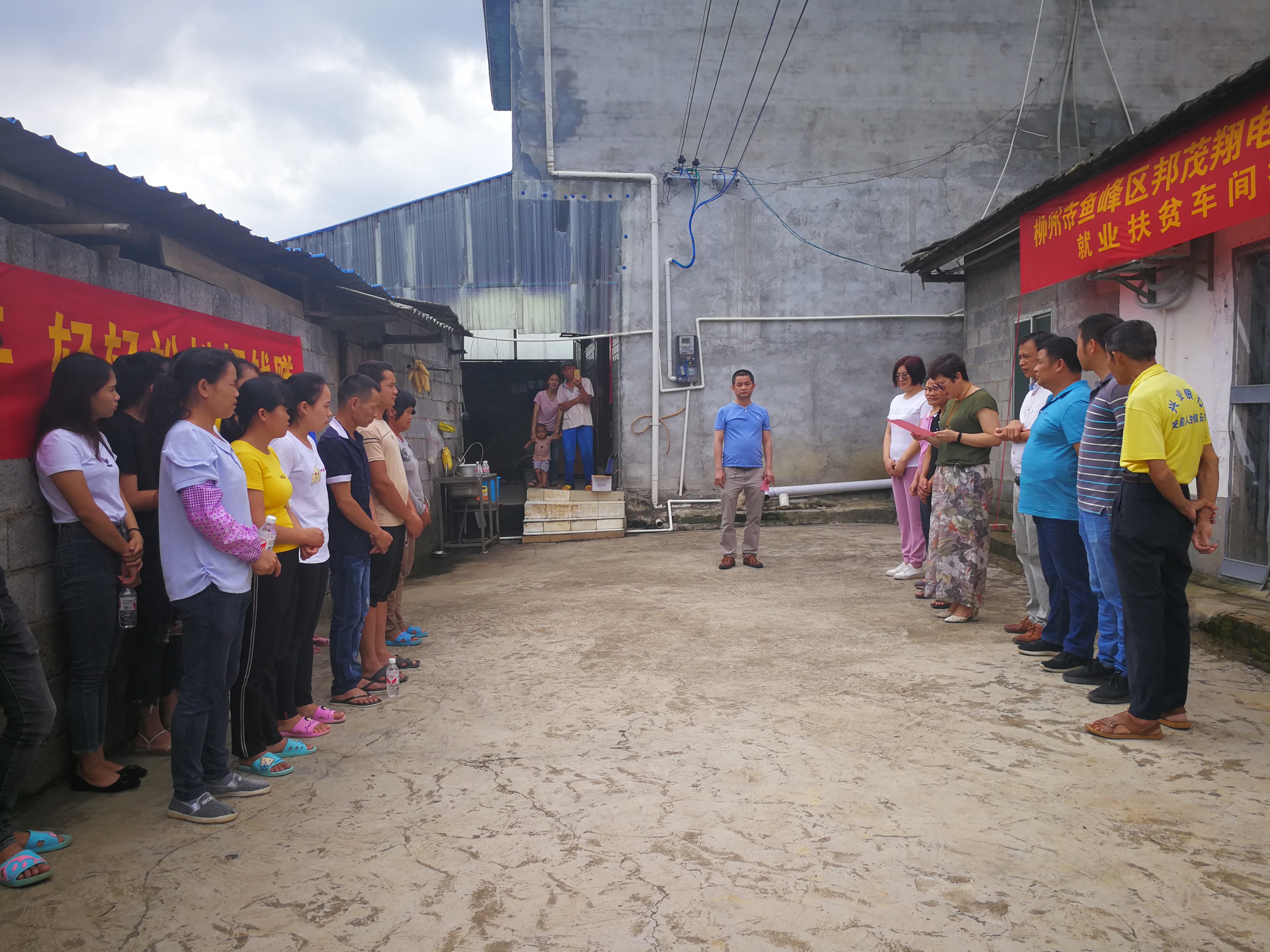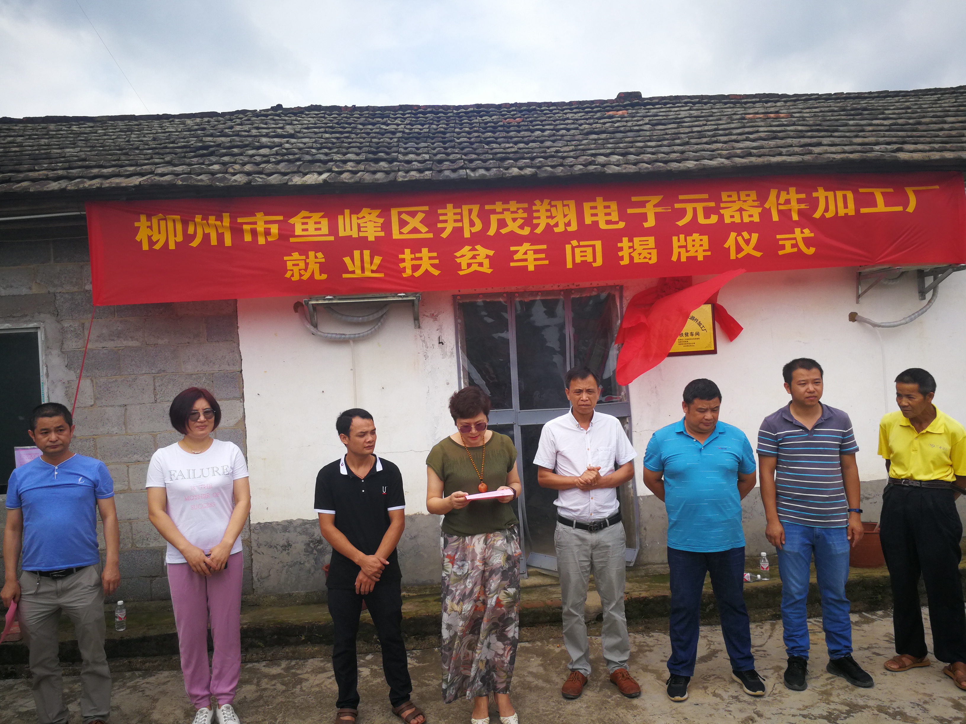 6月30日上午,鱼峰区白沙镇大电村扶贫车间举行揭牌仪式。区人社局局长宋志红、白沙镇副镇长黄仁新、区劳动保障管理中心主任毕志斌、柳州市鱼峰区邦茂翔电子元器件加工厂负责人韦礼华及区财政局、区扶贫办相关工作人员出席。