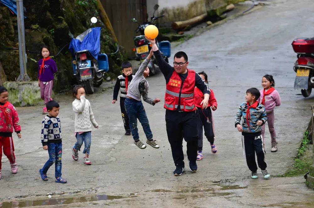 在柳州市融水苗族自治县杆洞乡党鸠村乌英苗寨,郑昌昊和孩子们玩耍(4月21日摄)。