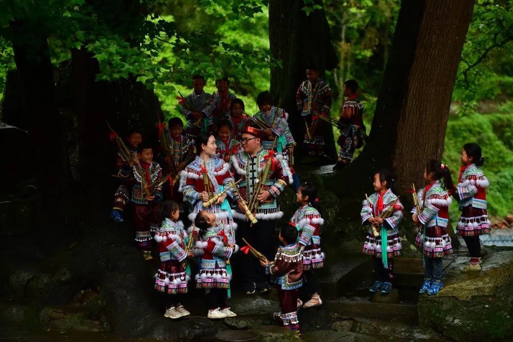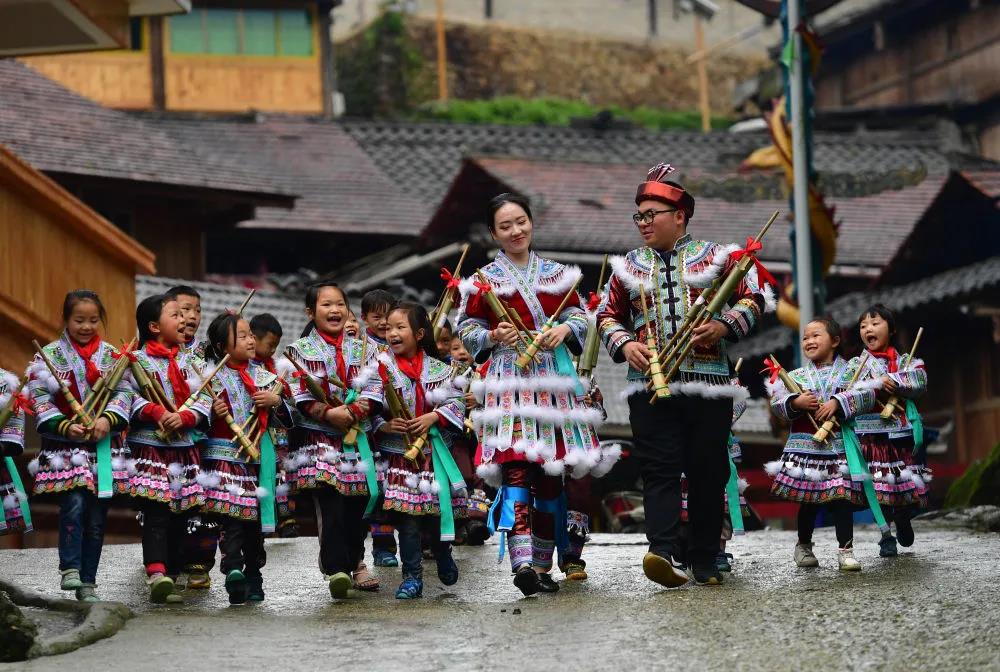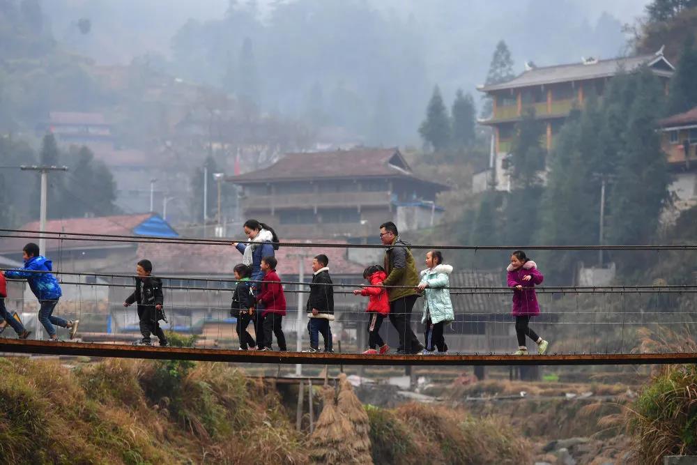 在柳州市融水苗族自治县杆洞乡党鸠村乌英苗寨,郑昌昊(右三)和吴晗(右七)带着孩子们到户外游玩(1月30日摄)。