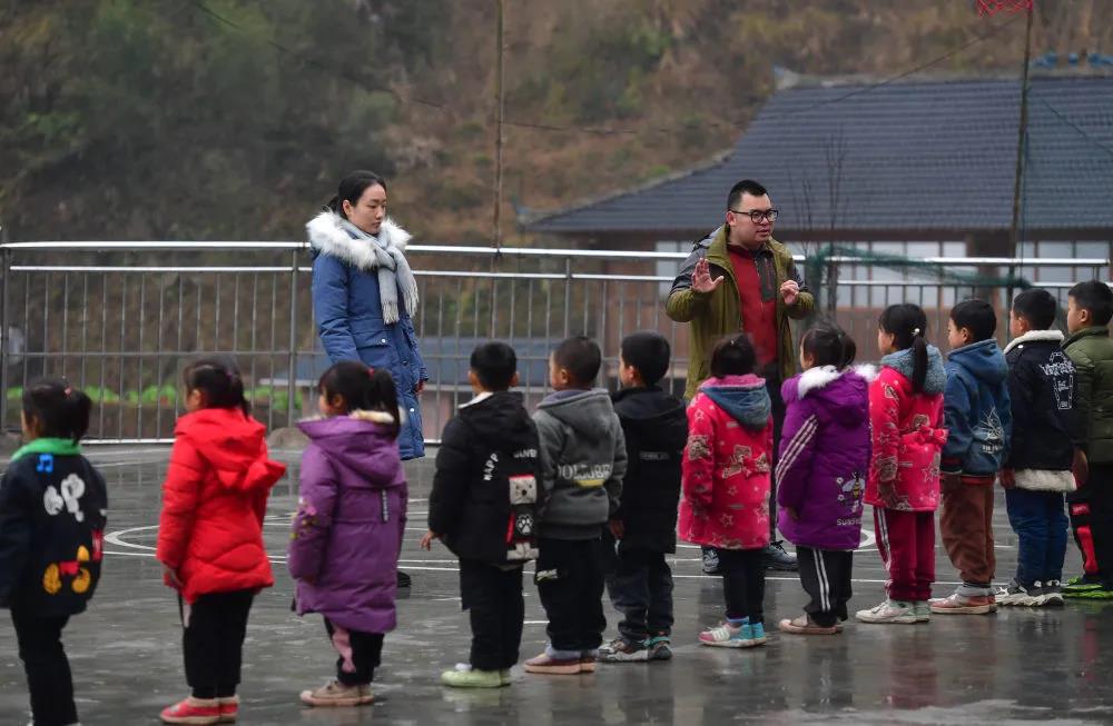 郑昌昊(后排右)和吴晗(后排左)给孩子们上户外课(1月30日摄)。