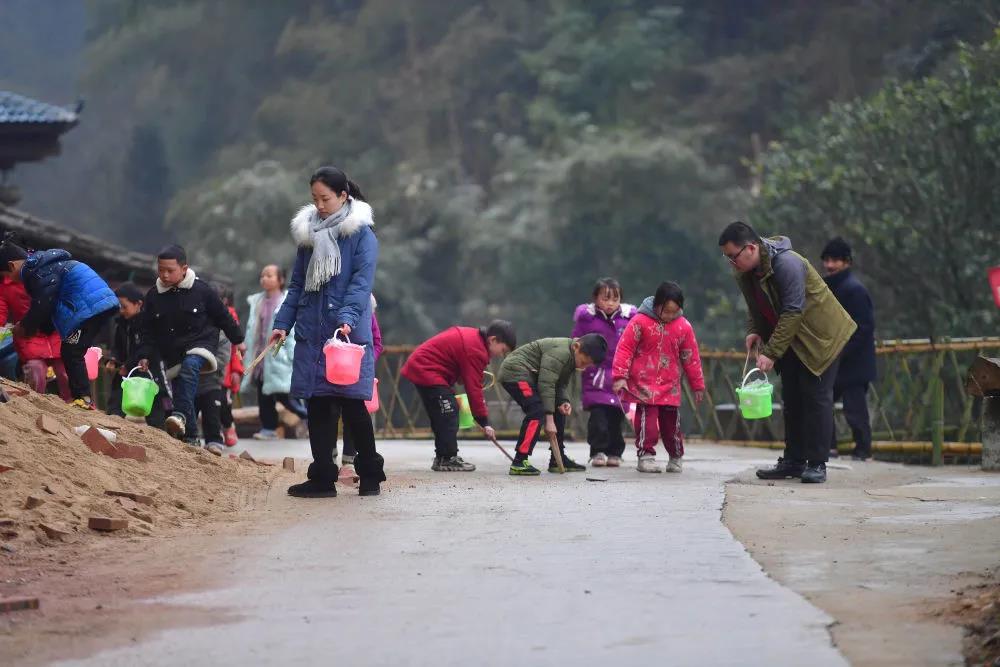 郑昌昊(前右)和吴晗(前左)带着孩子们打扫卫生(1月30日摄)。