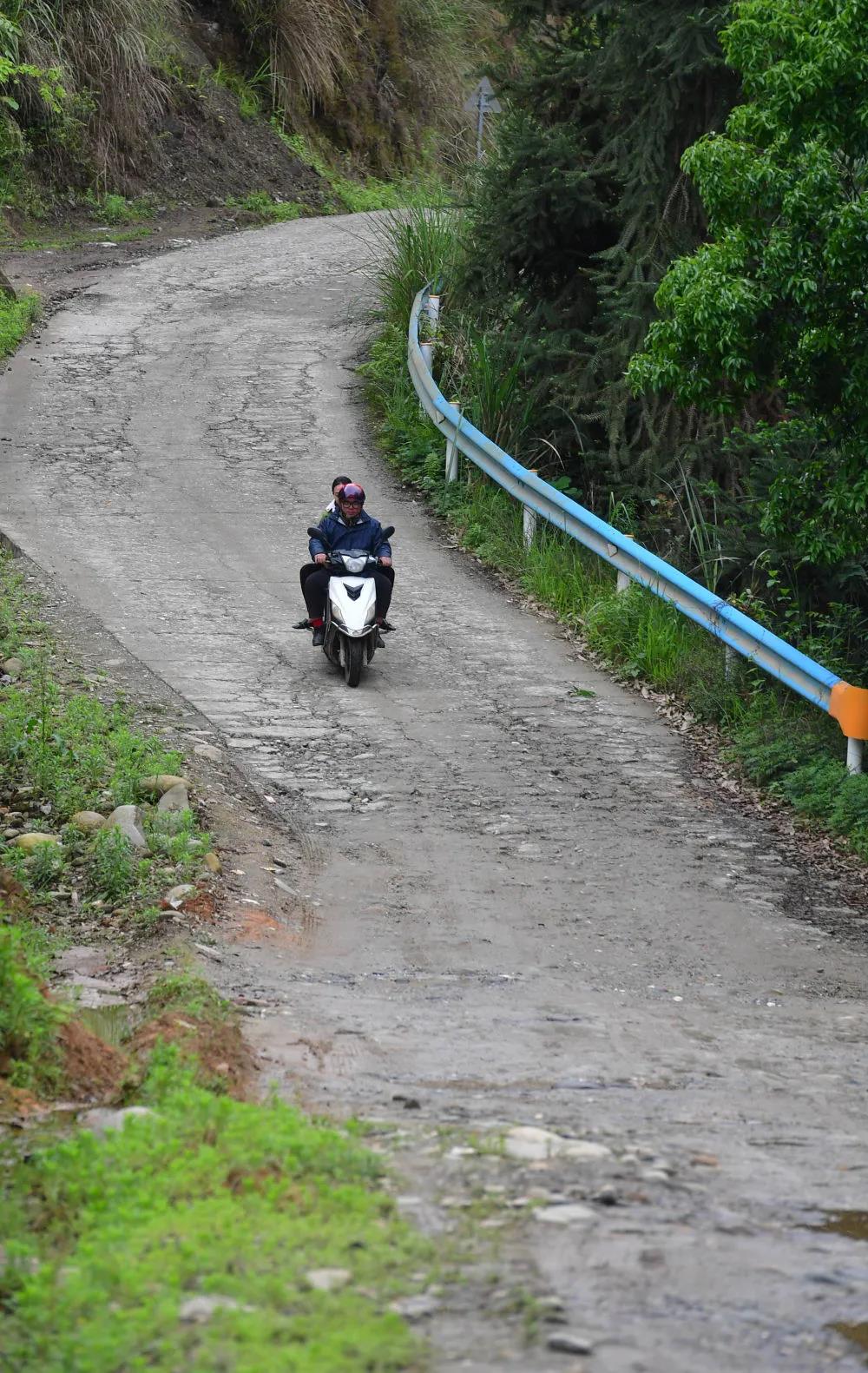 在贵州省从江县丙妹镇至广西融水苗族自治县杆洞乡的公路上,郑昌昊载着吴晗赶往乌英苗寨(4月14日摄)。