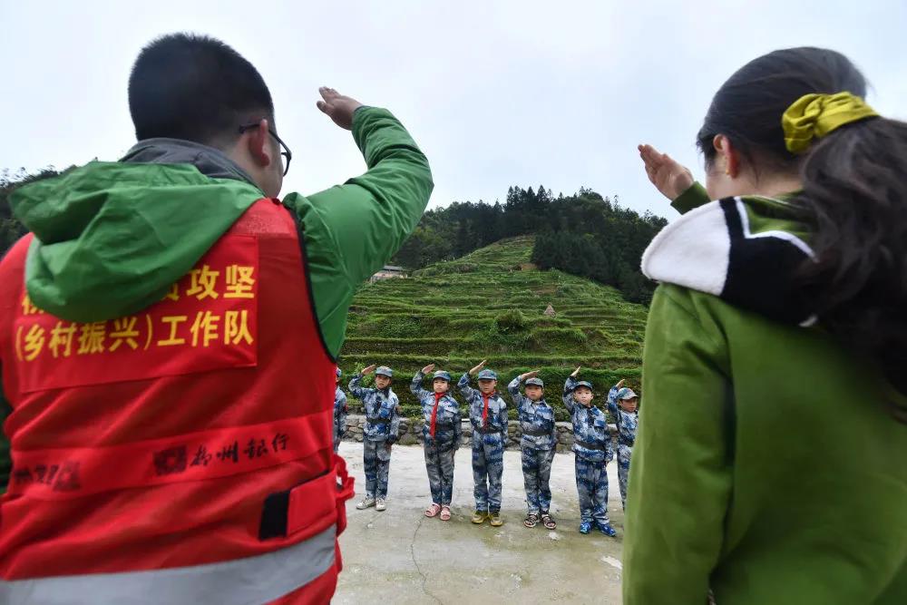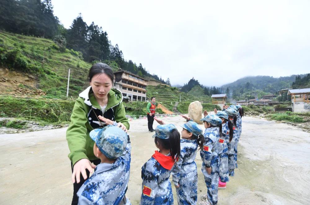 在柳州市融水苗族自治县杆洞乡党鸠村乌英苗寨,郑昌昊(前左)和吴晗(前右)在指导学生行少先队队礼(4月14日摄)。