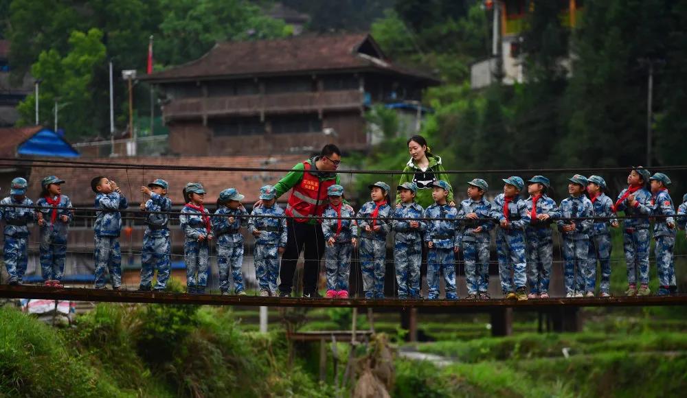 郑昌昊和吴晗带领学生了解苗寨的变化(4月14日摄)。