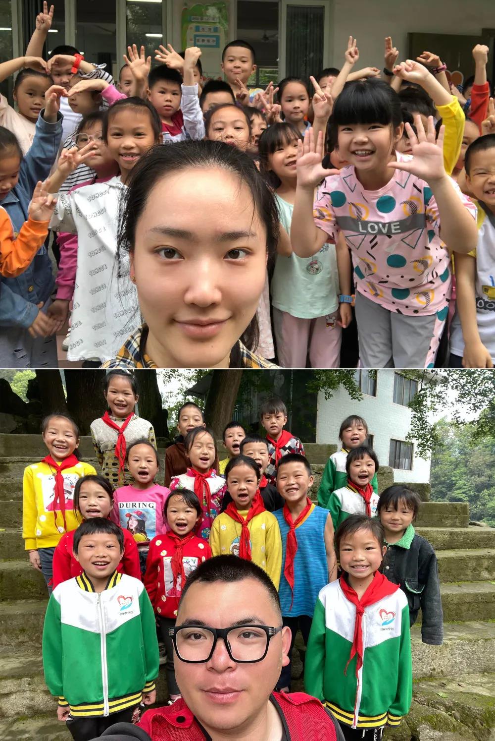 拼版照片的上图:在柳州市柳北区桂景湾小学,吴晗(前)和学生们自拍;下图:在柳州市融水苗族自治县杆洞乡党鸠村乌英苗寨教学点,郑昌昊(前)和孩子们自拍(照片均摄于4月23日)。