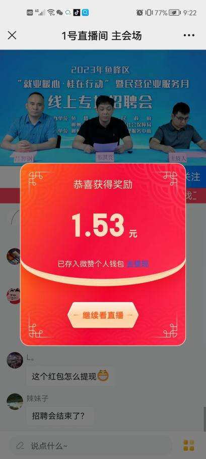 早上9:00启动仪式直播开始,为了吸引更多求职者前来参加,招聘会还策划了红包活动,观看直播时长达到10分钟以上,即可领取现金红包一个。