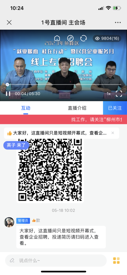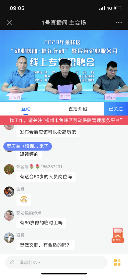 根据柳州市鱼峰区劳动保障服务平台后台数据显示,截至9:30直播热度(在线观看人数)达到5379人次,直播互动量高,不少求职者在评论区踊跃发言,迫不及待想要投递简历,纷纷在互动评论区询问“有哪些岗位”“如何投递简历?”等等,直播达到预期效果。