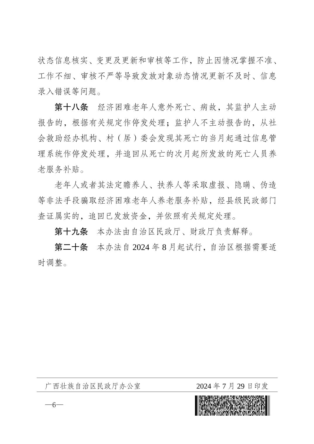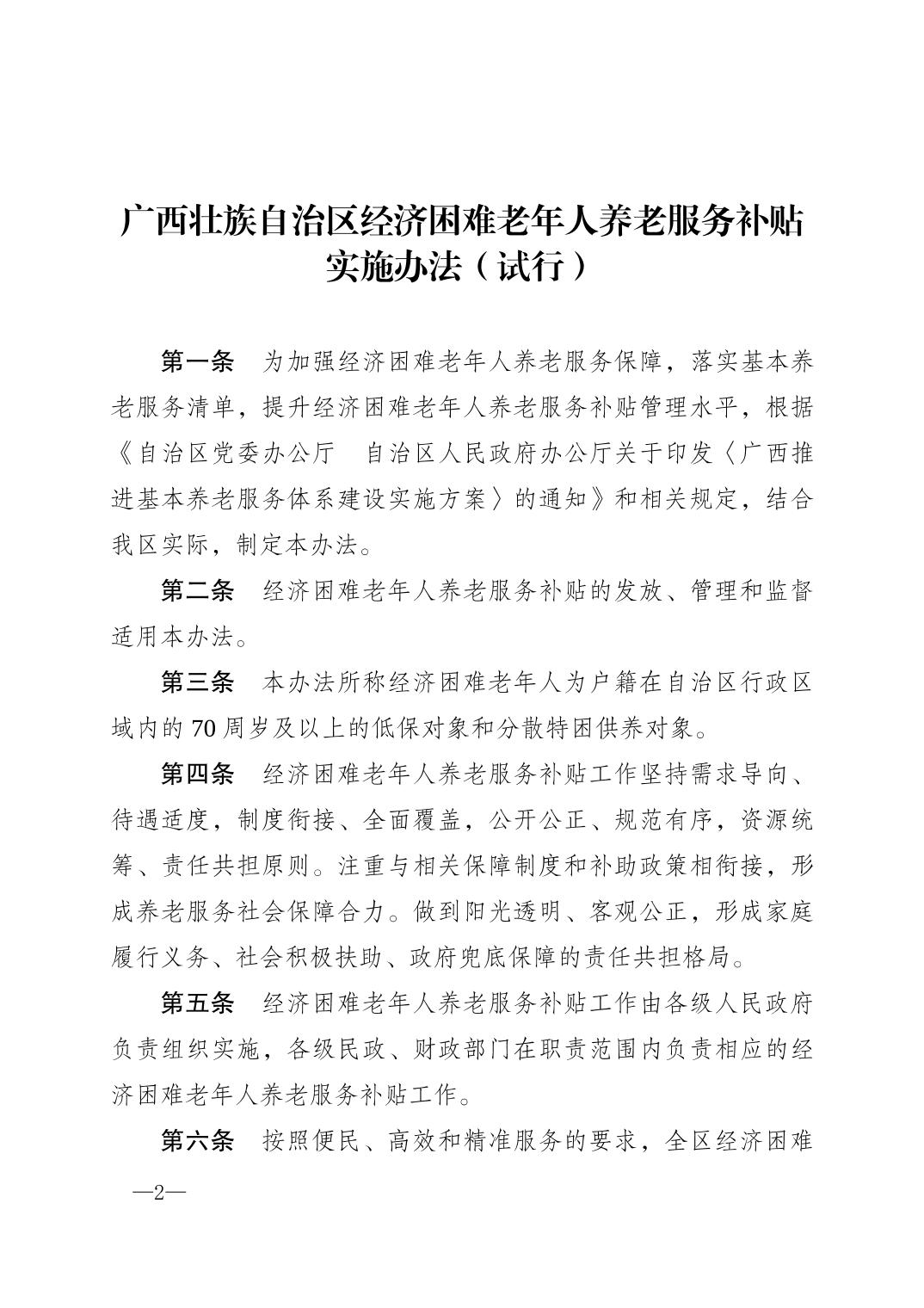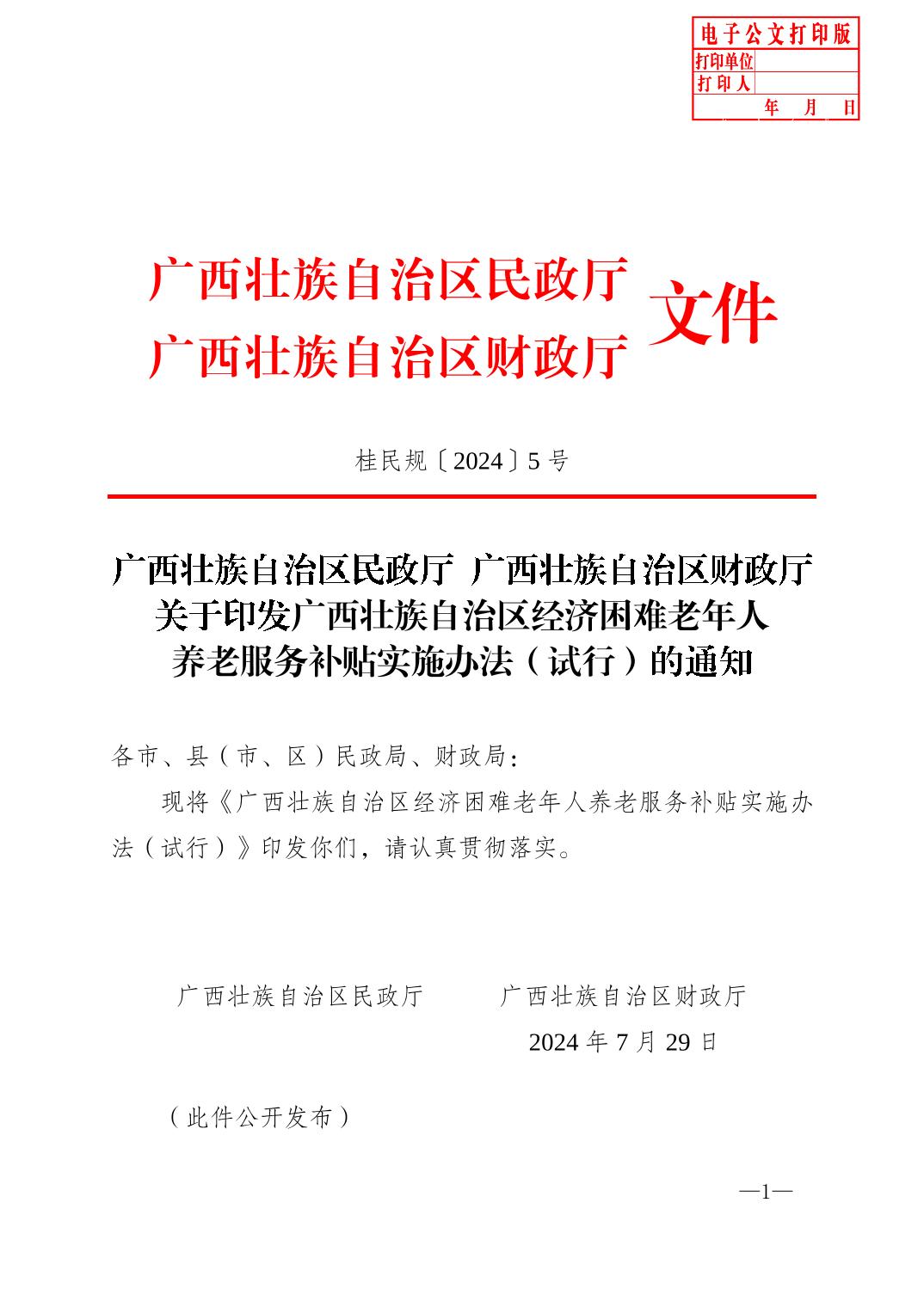 桂民规〔2024〕5号 广西壮族自治区民政厅 广西壮族自治区财政厅 关于印发广西壮族自治区经济困难老年人养老服务补贴实施办法(试行)的通知