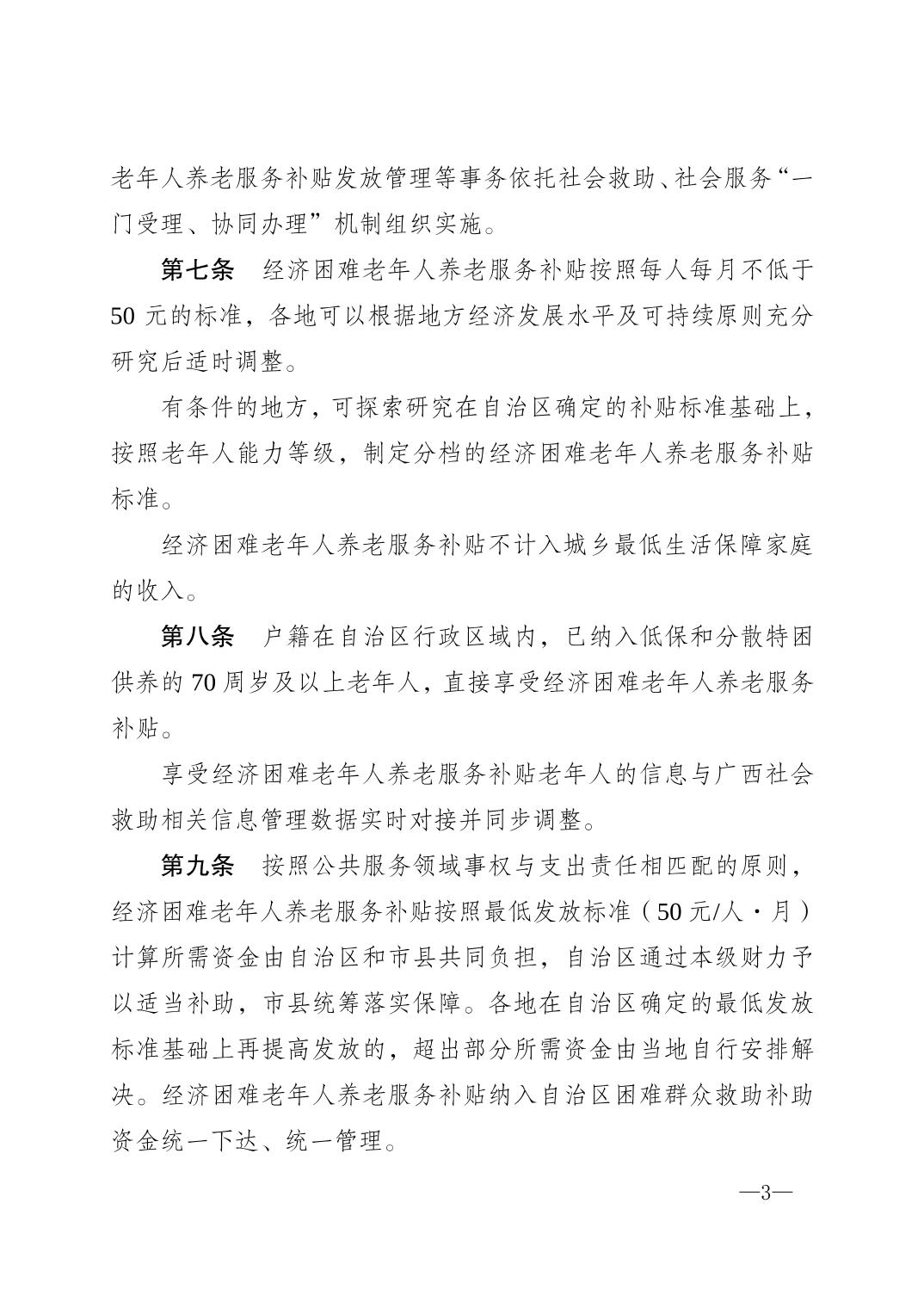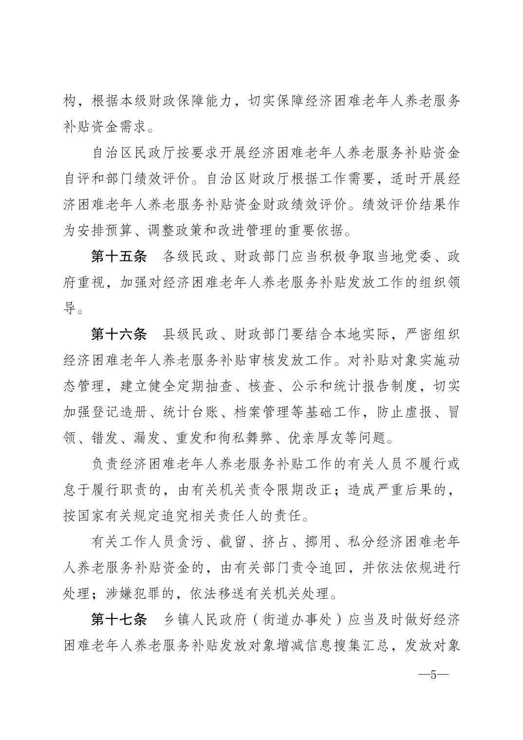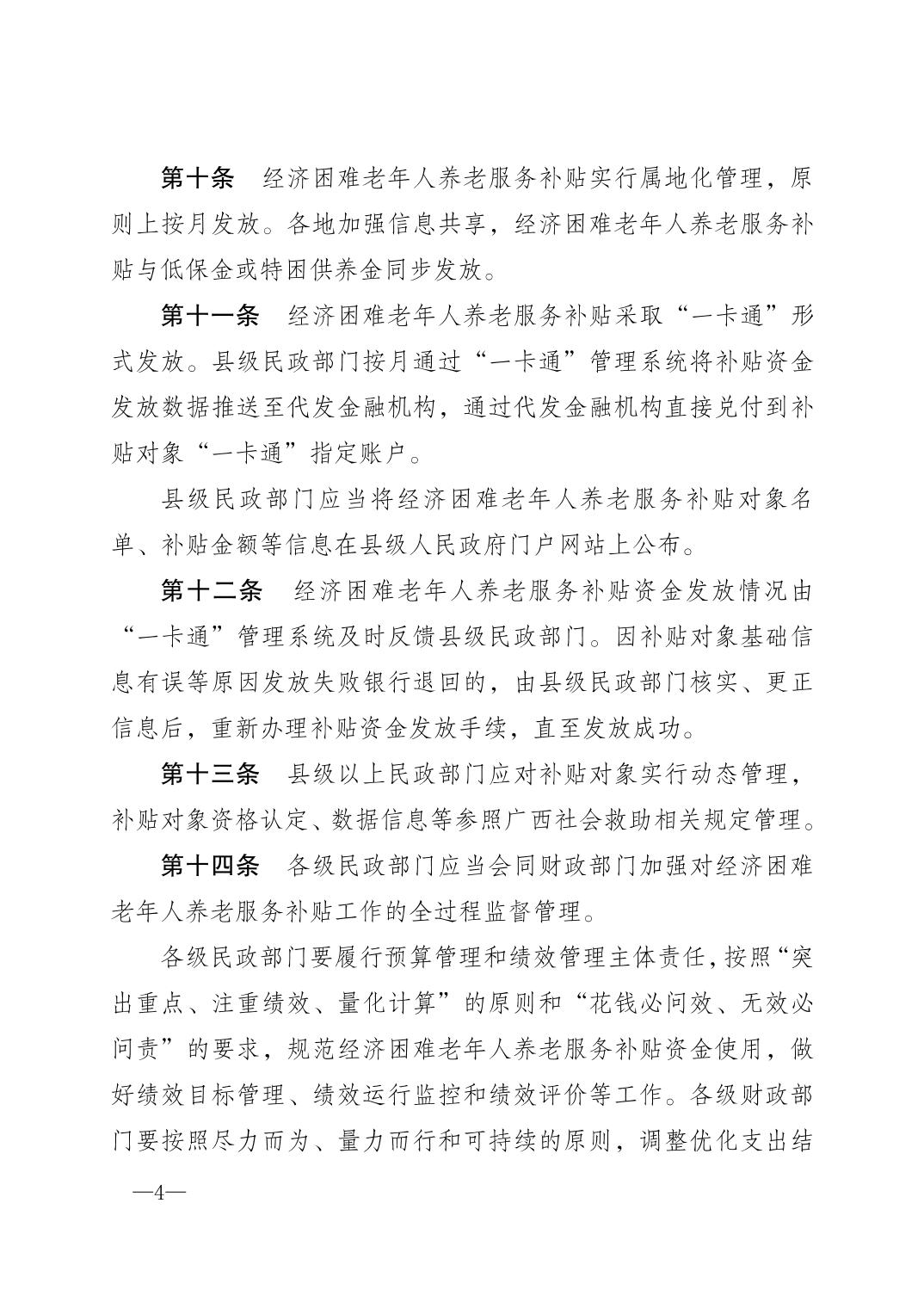 桂民规〔2024〕5号 广西壮族自治区民政厅 广西壮族自治区财政厅 关于印发广西壮族自治区经济困难老年人养老服务补贴实施办法(试行)的通知