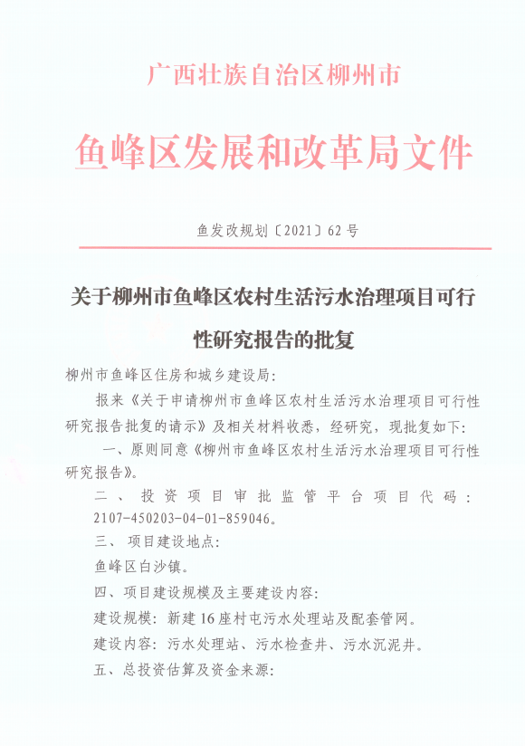 - 鱼发改规划〔2021〕62号 关于柳州市鱼峰区农村生活污水治理项目可行性研究报告的批复