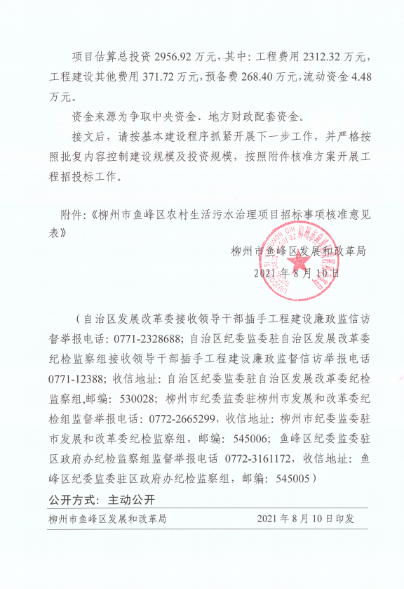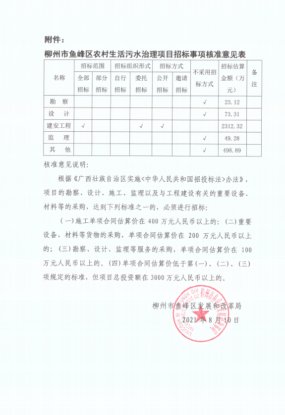 鱼发改规划〔2021〕62号 关于柳州市鱼峰区农村生活污水治理项目可行性研究报告的批复