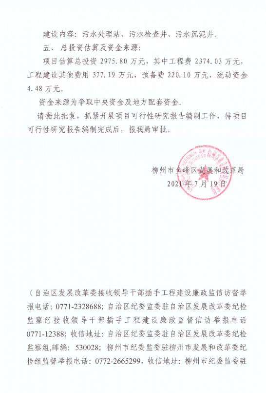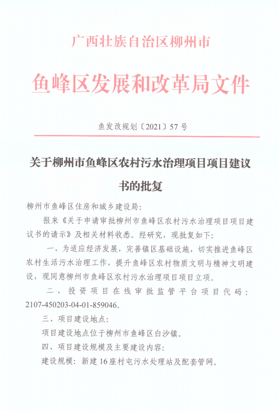 鱼发改规划〔2021〕57号 关于柳州市鱼峰区农村污水治理项目项目建议书的批复