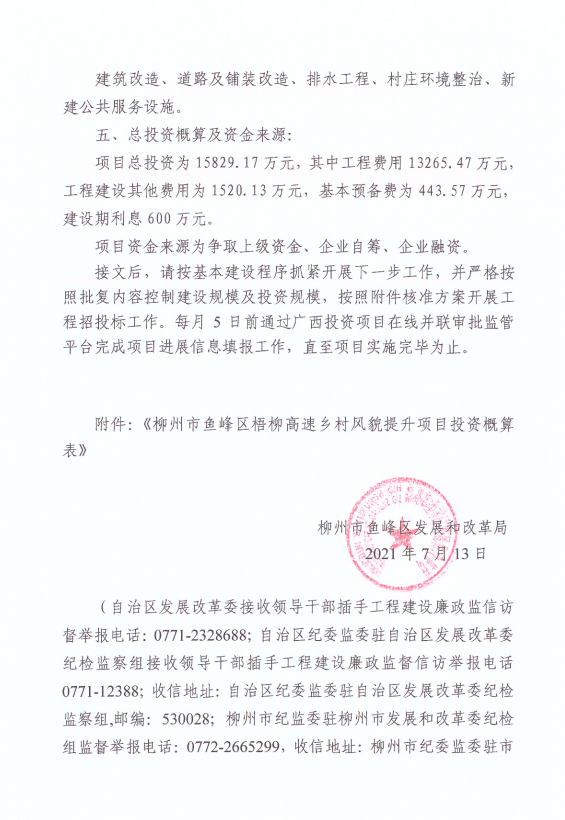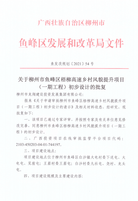 鱼发改规划〔2021〕54号 关于柳州市鱼峰区梧柳高速乡村风貌提升项目(一期工程)初步设计的批复