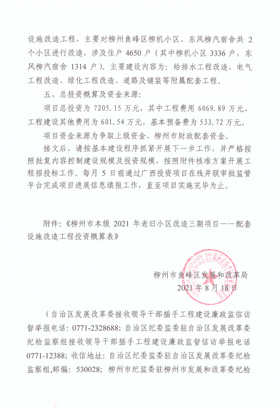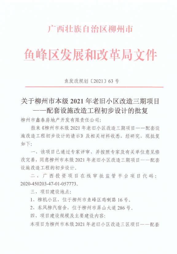 鱼发改规划〔2021〕63号 关于柳州市本级2021年老旧小区改造三期项目——配套设施改造工程初步设计的批复