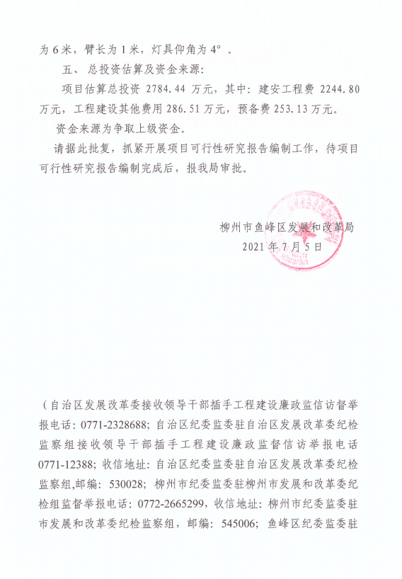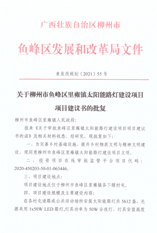 鱼发改规划〔2021〕55号 关于柳州市鱼峰区里雍镇太阳能路灯建设项目项目建议书的批复