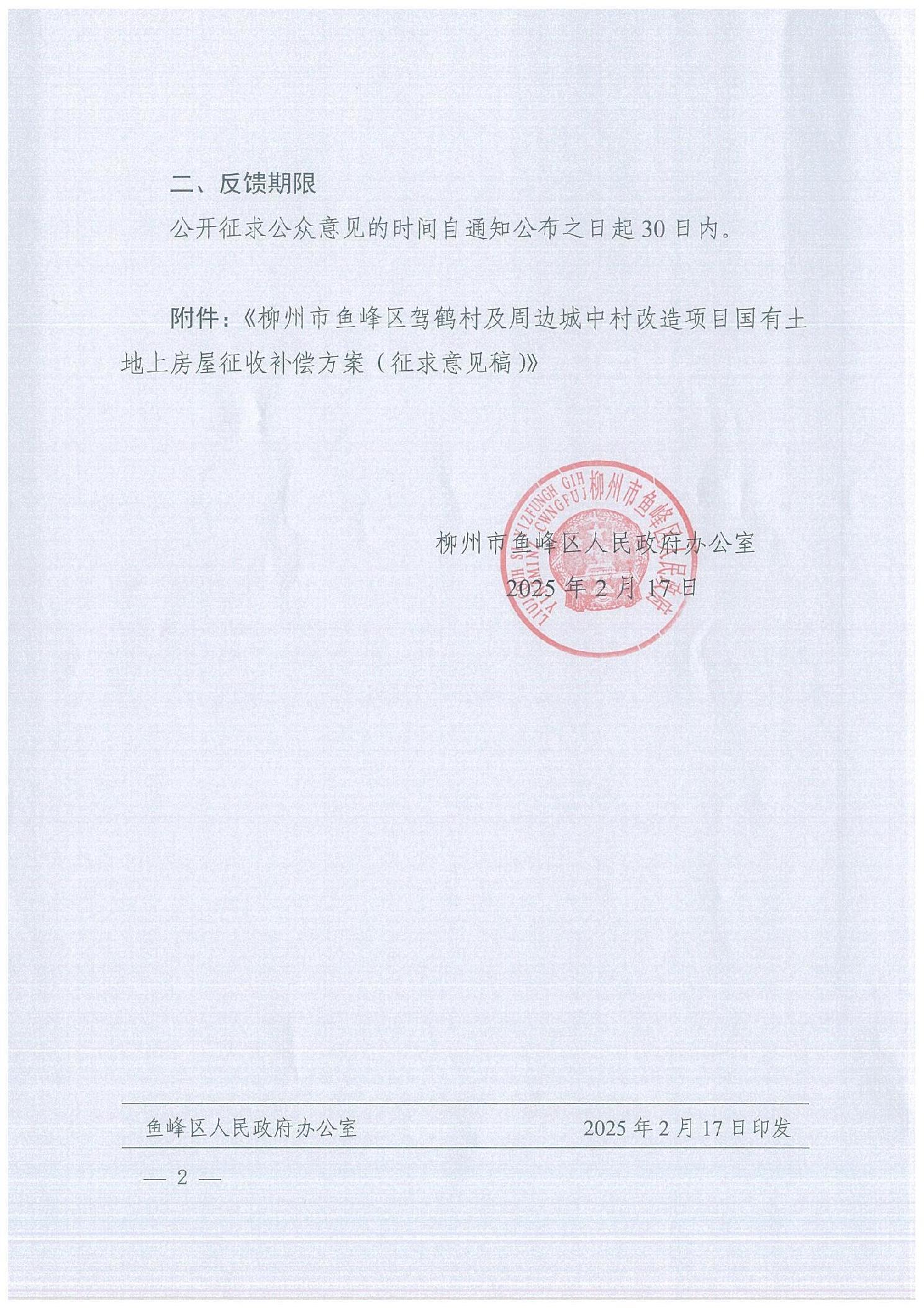 关于公开征求《柳州市鱼峰区驾鹤村及周边城中村改造项目国有土地上房屋征收补偿方案》意见的通知