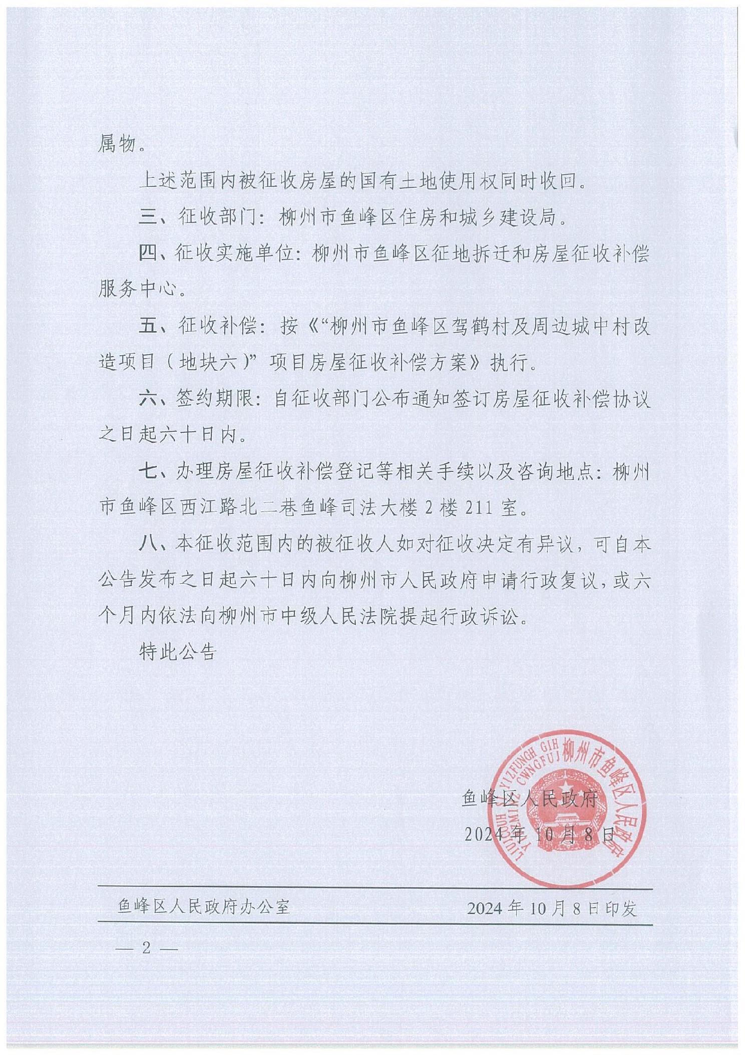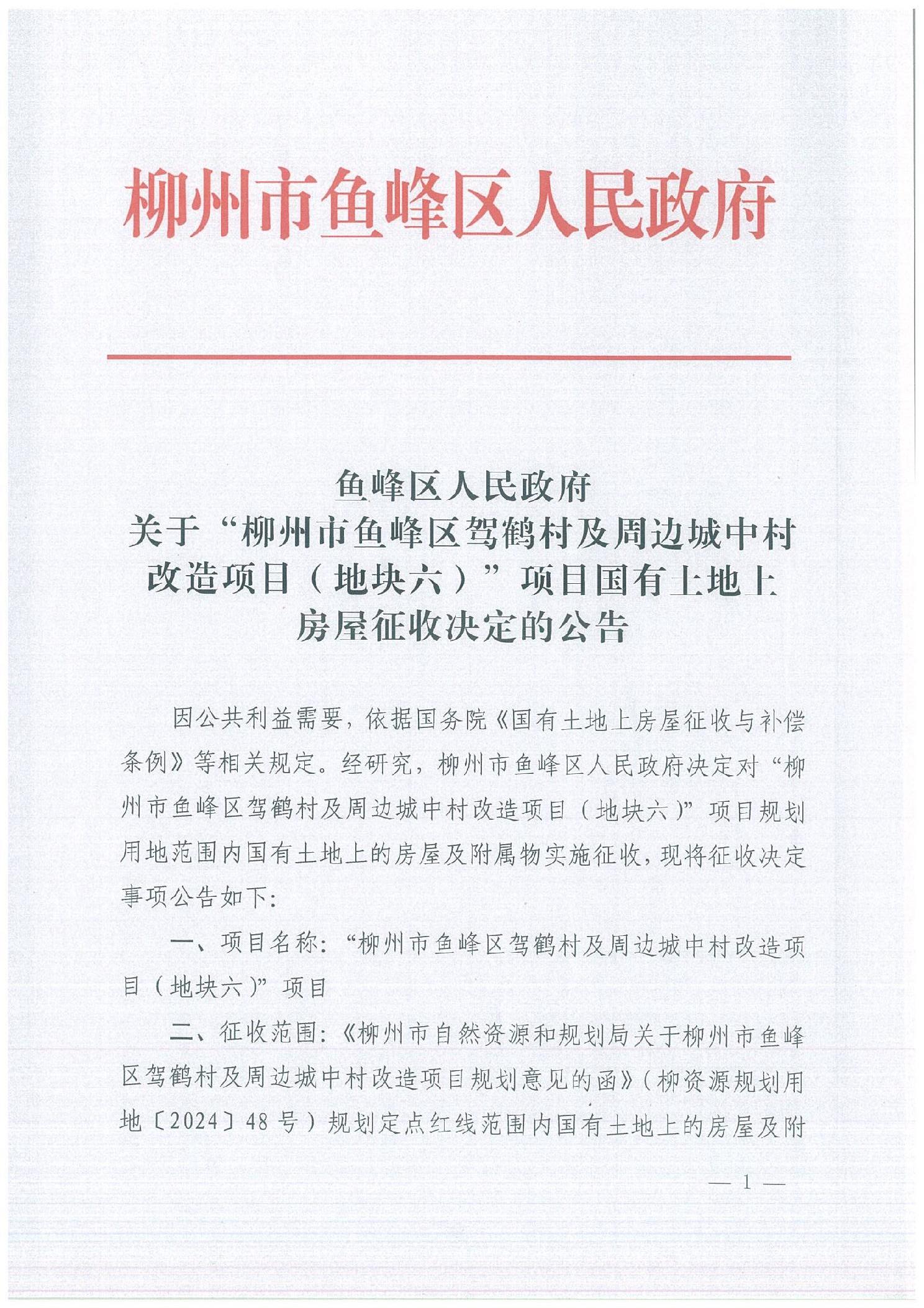 关于《“柳州市鱼峰区驾鹤村及周边城中村改造项目(地块六)”项目国有土地上房屋征收决定的公告