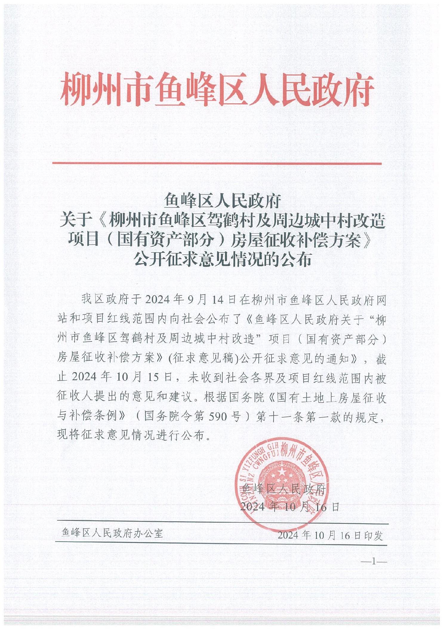 关于《柳州市鱼峰区驾鹤村及周边城中村改造项目(国有资产部分)房屋征收补偿方案》公开征求意见情况的公布